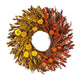 The 22" Sunset Fields Wreath is designed with Sudan grass, grain millet, flax pods, sage green eucalyptus, saffron, and strawflowers in orange and yellow in sunset colors.