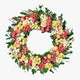 Follow your Heart with this beautiful wreath designed with green integrifolia leaves, sage green leaves, phalaris, pink larkspur, natural daisies, almond fern, and globe thistle.