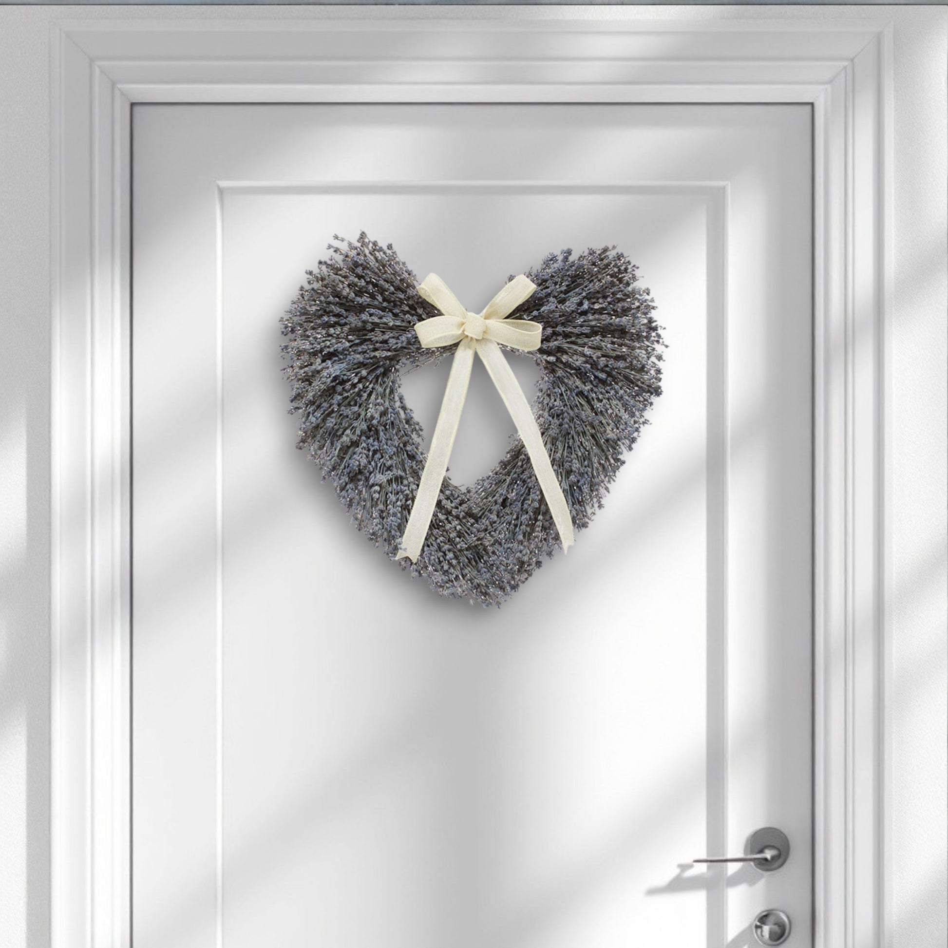 We harvest English Lavender each year in August and September. After we dry the stems, we store them in a cool barn until we need the bunches to make beautiful wreaths. This heart is designed of English Lavender and accented with a linen ribbon bow. Hang it indoors and Enjoy!