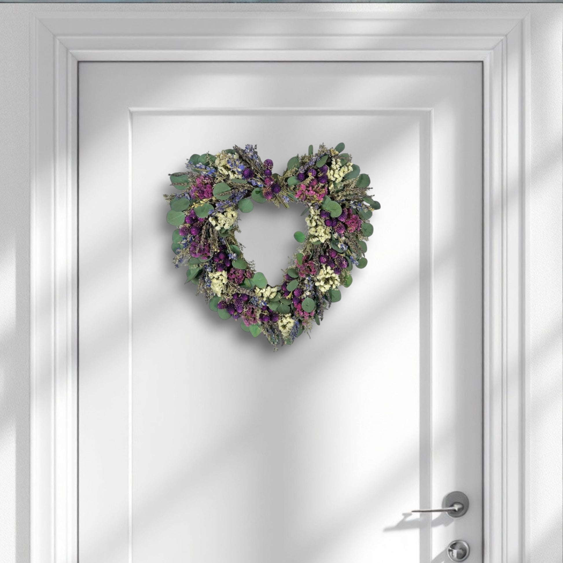 Our Lavender in the Mist heart is designed with natural white sinuata blooms, English Lavender, lavender larkspur stems, preserved green silver leaves and purple globe amaranth.